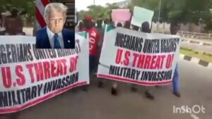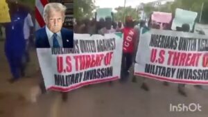 A viral video has surfaced showing Nigerians staging a protest allegedly in Lagos following U.S. President Donald Trump’s claim that Christians in Nigeria are being subjected to genocide and his threat to deploy military intervention —
