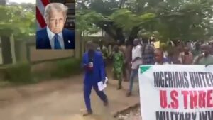 A viral video has surfaced showing Nigerians staging a protest allegedly in Lagos following U.S. President Donald Trump’s claim that Christians in Nigeria are being subjected to genocide and his threat to deploy military intervention —